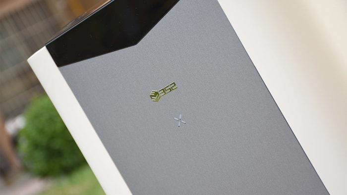 机身正面是一整块灰色的拼接,左右两侧的白色部分直接延伸到正面。靠上的位置镶嵌着352的品牌标识,这是一颗采用金属电镀工艺的标识。下方有一个X型的指示灯,通过不同的颜色来表示不同的工作状态。