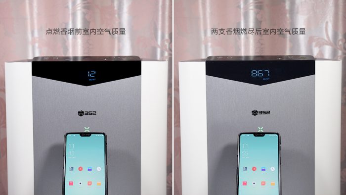 受限于测试环境和条件,对于净化性能的测试只能使用香烟来模拟测试。测试条件如下:在一个面积约20平方米相对密闭的房间内点燃两支香烟,在两只香烟燃烧殆尽时打开空气净化器进行测试,点燃香烟前室内PM2.5数值为12,两支香烟燃烧殆尽时PM2.5数值为867。