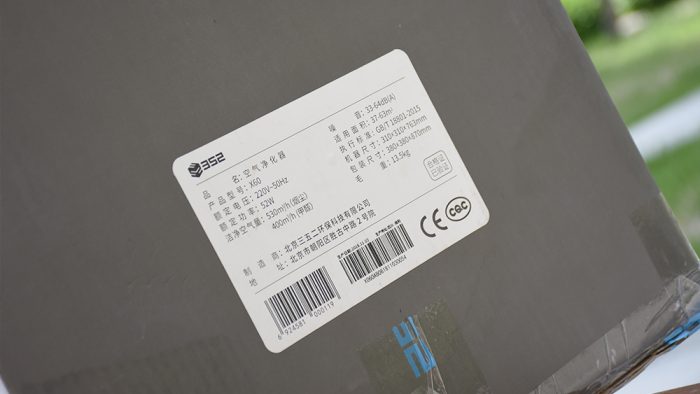 整个包装还是延续了352家族一贯的设计风格,以白色和灰色相间,简洁大方。盒子正面最醒目的就是下半部分的X60机身渲染图,左上角印有352的品牌标识,中间印有空气净化器和“高效、智能、静音”的字样,也是这台空气净化器主打的功能亮点。