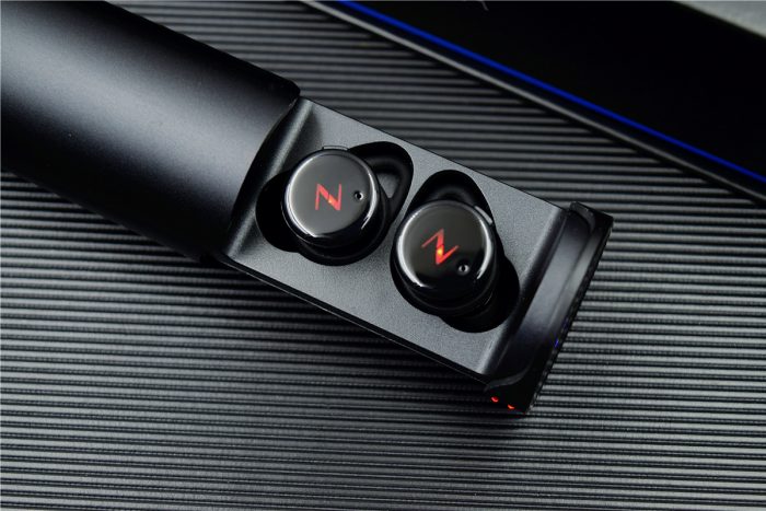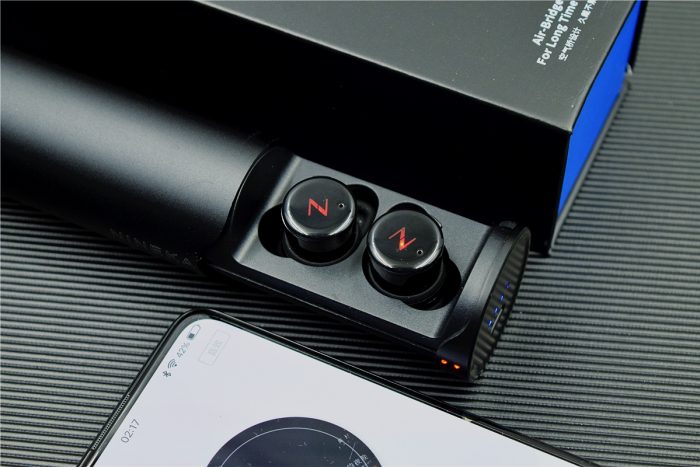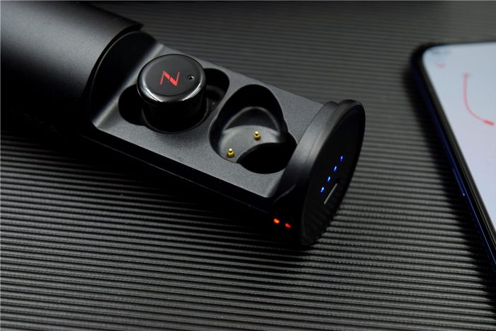 南卡T1的充电仓采用了抽拉式设计,每次将耳机放入后就会自动进行充电,其中充电仓能够提供约30小时的续航时间,充电过程中耳机上的指示灯为红色常亮,充满后变为蓝色随即熄灭,在充电仓靠近“NINEKA”标识的右侧还有两颗充电指示灯,而充电仓的剩余电量指示灯为蓝灯常亮。