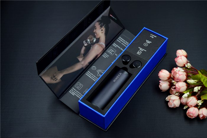南卡T1采用了黑色的包装盒,正面印有品牌logo和产品名称,靠近底部的位置通过中英双语突出了耳机的佩戴舒适性,整体设计简洁大气。