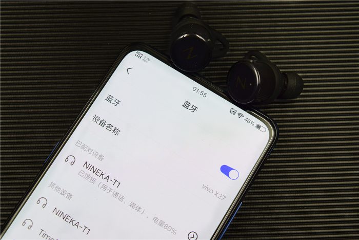 南卡T1支持多种连接方式,支持双耳模式和单耳模式,既可以两个耳机配对后同时时候,也可以只使用其中的一个耳机。如果是双耳模式的话,使用前将左右耳机从充电仓中取出,两只耳机会自动开机并配对,首次配对大概需要6秒左右,然后在手机上连接名为“NINEKA T1”的设备即可,连接后还能查看耳机当前的剩余电量。