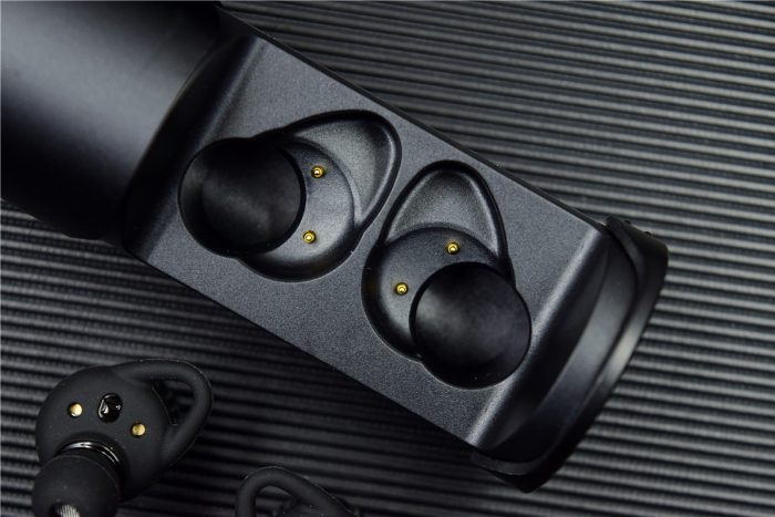 耳机的背面印有“L”、“R”字样,可以方便用户快速进行区分,另外还有两个金属触点,这是耳机的充电触点,可以配合充电仓进行充电。