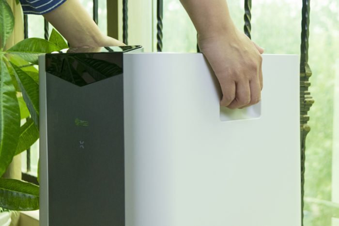 机身正面,除了上面的镜面352 品牌LOGO外,再无其他装饰,在光照下会呈现耀眼的光芒。在LOGO下方,还有一个类似X形状的LED状态灯,开机时会亮起。而且它会根据空气质量的好坏而变换颜色,空气优则为绿色,空气差则为红色,便于用户及时了解空气状态。