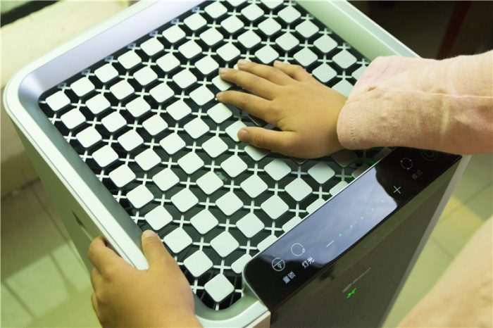 352 X60的出风口位于机身的顶端,采用同等大小的方块网状结构设计格栅,看上去非常的美观,而且还保证了风量的流动。在安全方面做得也很到位,网状格栅非常的密实,孩子手指是很难伸进去的,配合童锁功能,完全不惧熊孩子。
