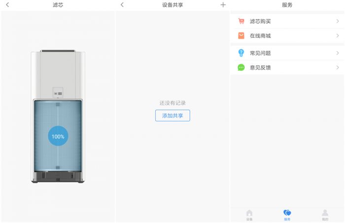 APP的界面设计非常的简约清新,所有功能一目了然,上手操作非常简单,首页界面下方操控区域包括了:开关机,风量大小调节,模式切换和灯光开关。此外在设置菜单中,还可以实时观察滤芯的使用情况,也可以把设备分享给家人等,非常全面。