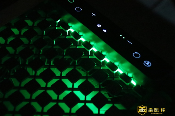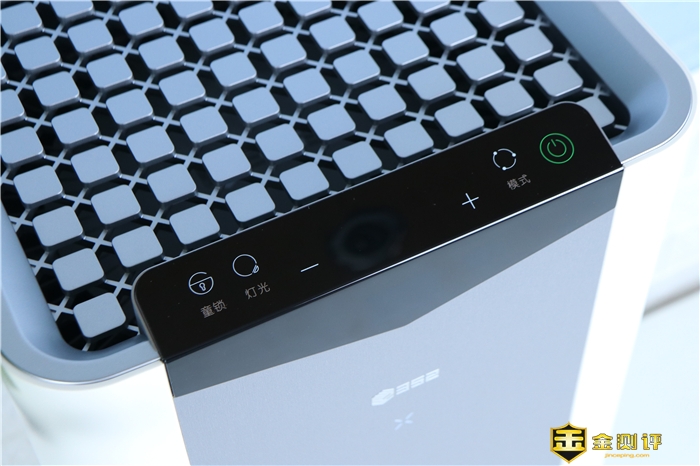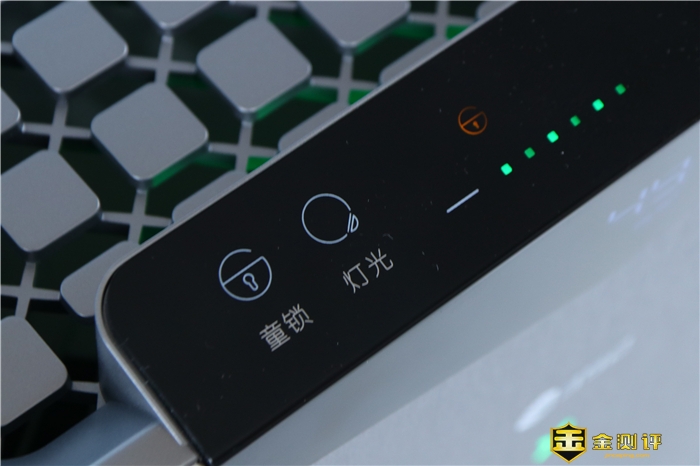 352 X60所有的操控按键也是位于黑色面板处,只不过位于顶端而已。从左至右依次是:童锁,灯光,风量加减控制,模式切换和电源开关键。在点亮主机运行后,除了电源键呈现绿色背光外,其它按键均为白色背光。