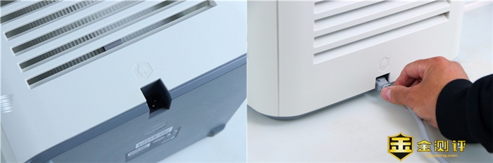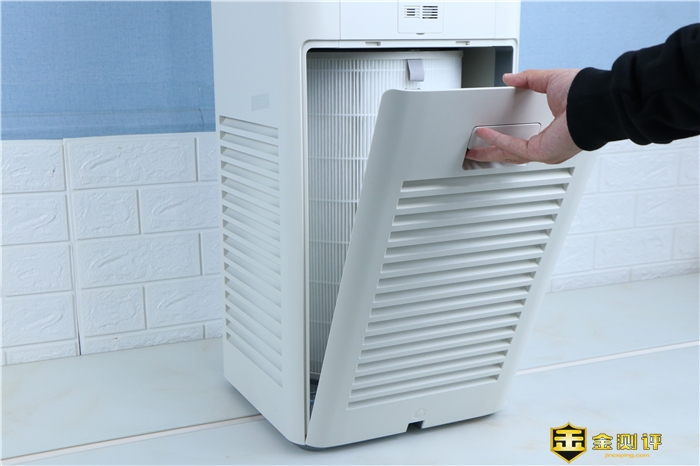 透过正背面的滤芯舱门,可以看到里面硕大的核心组件滤芯了。滤芯舱门采用卡扣的固定方式,要想打开只需要用手掰动上方的凹槽,便可以轻松打开。