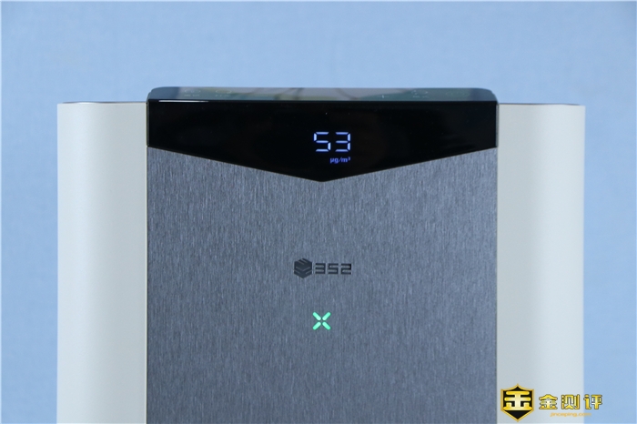352 X60机身正面没有什么花哨的装饰,除了一个镜面效果的352品牌LOGO 外,再就是一个X形状LED指示灯,它是可以根据空气质量好坏而变换颜色的,红色则代表空气质量差,绿色则代表空气质量优秀。从LOGO处往上看,面向我们的黑色面板居中位置,则是一块单色的数字显示屏,它主要是用来表示实时空气PM2.5数值的。这样用户在使用的时候,可以对空气质量一目了然。