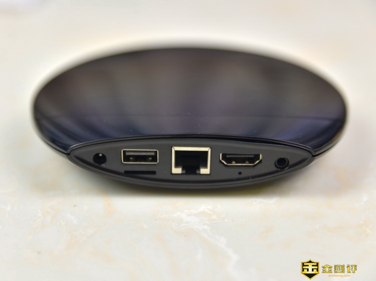 泰捷WE30PRO机身尾端的接口很丰富,从左到右分别是电源插孔,USB2.0接口,MicroSD卡槽,RJ45网口,HDMI 2.0接口,Reset重置插孔,AV接口。