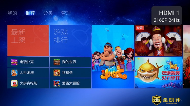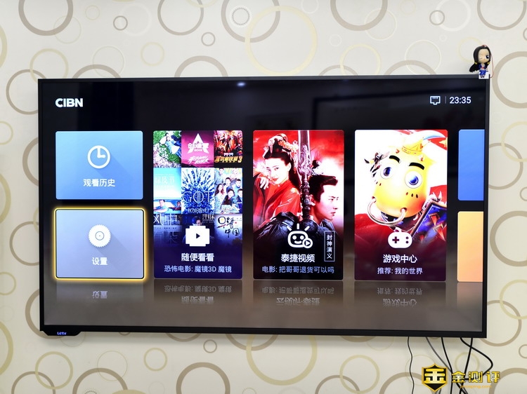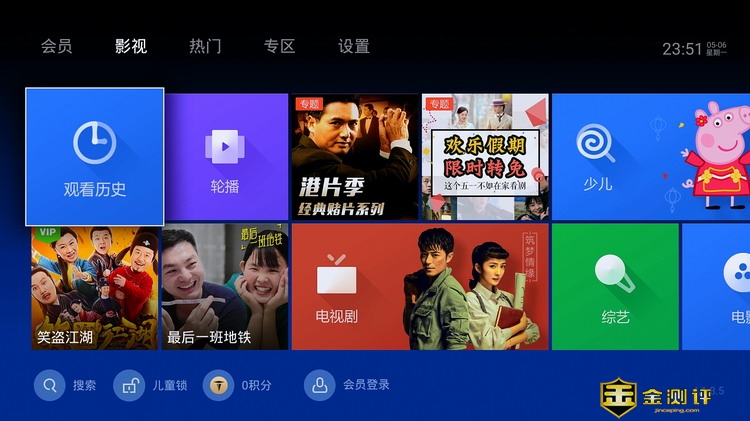 系统的启动比较快,遥控器的操作响应及时,流畅度较好。在系统的主界面上,有观看历史,设置菜单,随便看看,泰捷视频,游戏中心这几个项目。