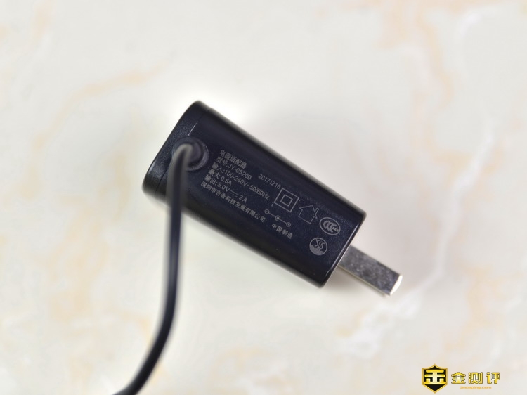 电源适配器上印有泰捷的Logo,输出的电压电流是5V/2A.