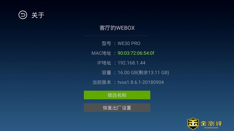 在关于里面有泰捷WE30PRO的相关信息,可以看到目前的操作系统是tvos1.8.6.1-20180904,这是基于安卓5.1.1版深度定制的操作系统。