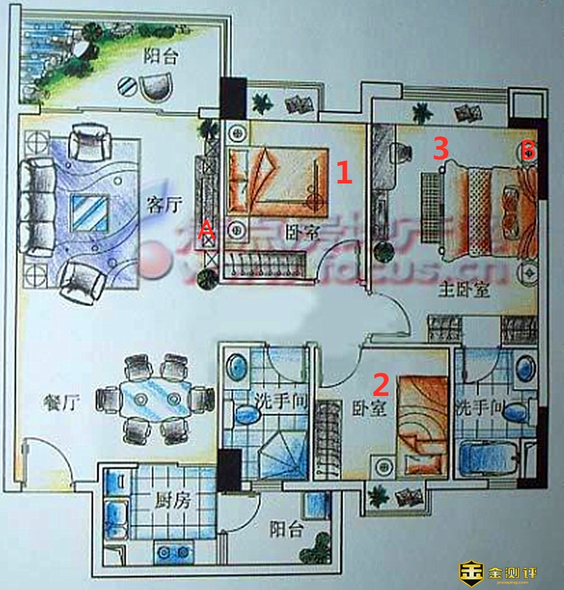 我家的三房二厅二卫的户型图,在客厅A处放置母路由器,在隔了两墙的3号主卧室的B处插入子路由器。然后对1号卧室、2号卧室和3号主卧室的wifi信号测试。