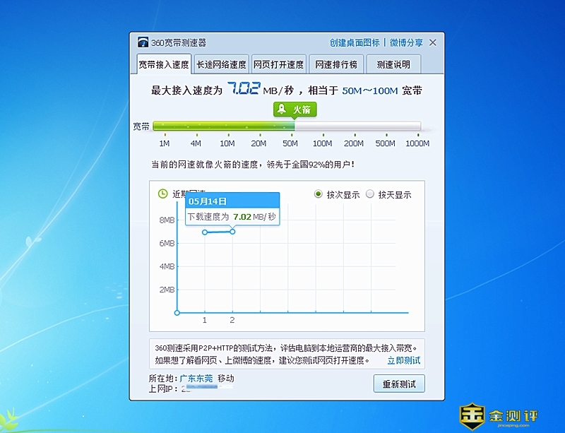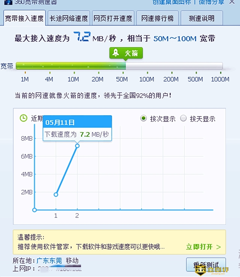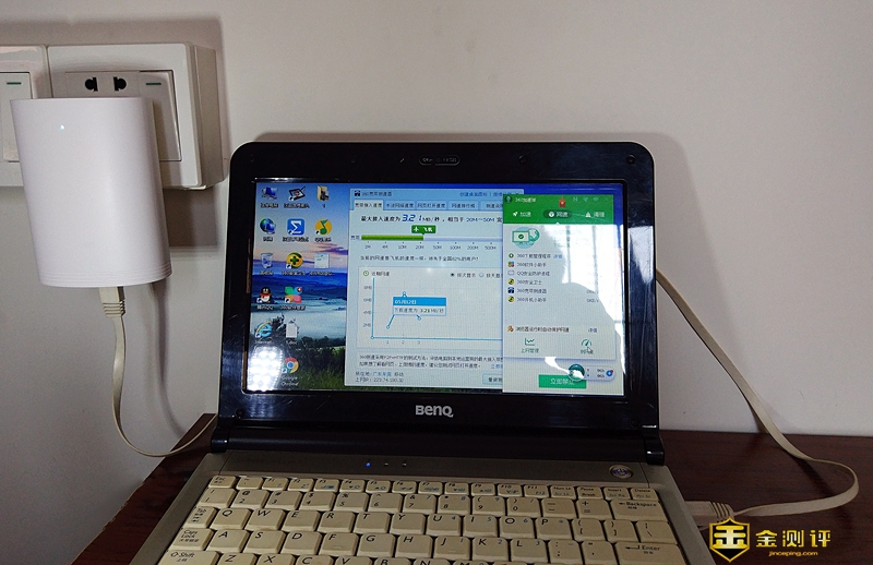 同样用一条网线把子路由器与手提电脑连接组网,也使用使用360宽带测速器,测得它的网速也是相当于50M-100M宽带,上网、看视频和打游戏也非常流畅。