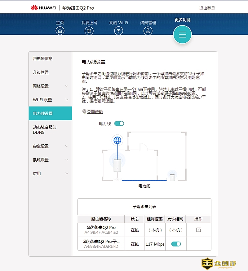 在更多功能页面的电力线设置中可以查看子母路由的在线情况、组网速率。如我将子路由插到隔了两墙的墙插座上时,查看到它组网速率为117Mbps,使用APP对网络进行一键体检,得到已接入设备稳定,子路由与母路由组网速率良好。在系统设置中可以对母路由器的WAN网口进行设定。