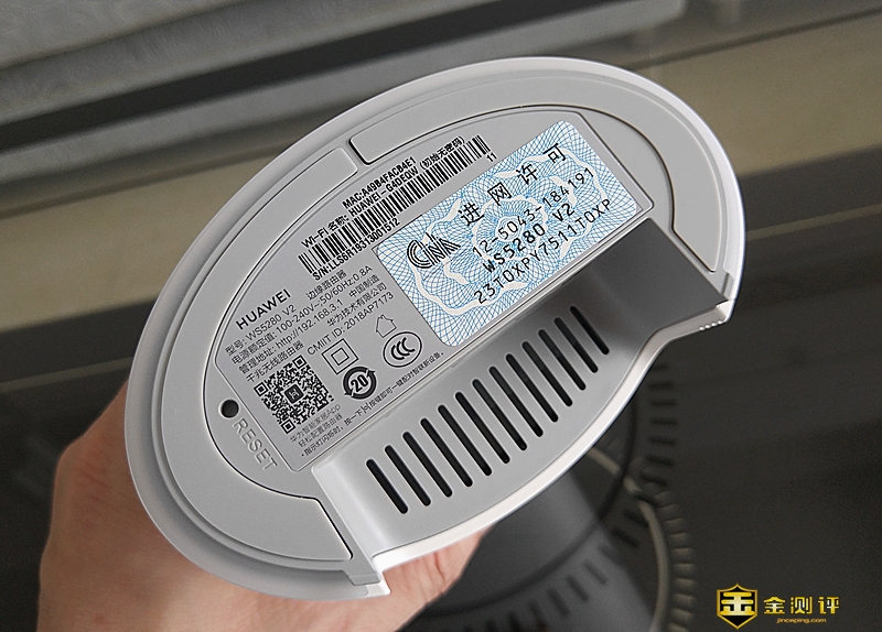 它的底部的外圈设置了两条防滑胶垫,让它摆放在桌面更牢固,还设置了一个针孔式 reset 键 和镀有路由器的品牌、名称、型号、电源额定值、管理地址、初始WIFI名、华为智能家庭app等信息。