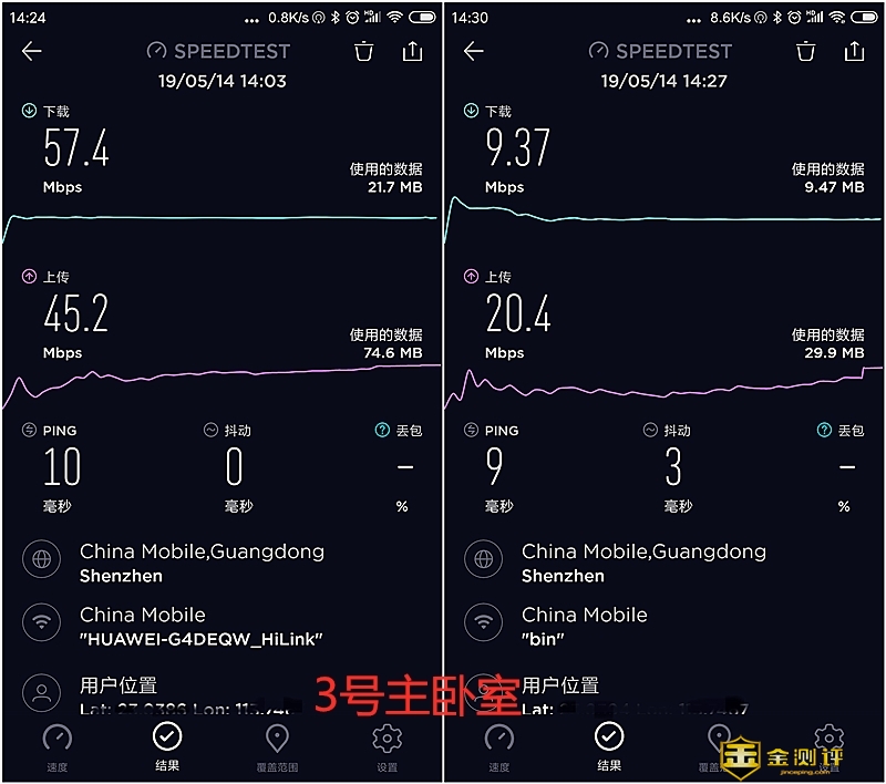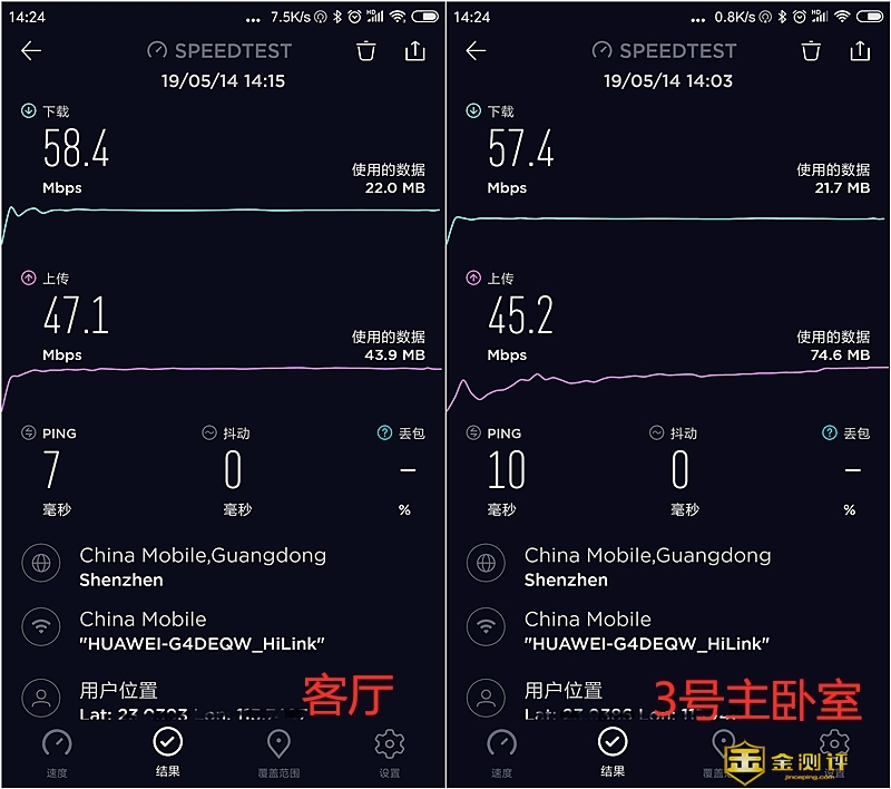 为了测试母路由器的穿墙能力,我把隔了两墙的3号主卧室的子路由器拨下来。使用“speedlest”网速测试软件进行测试,先在客厅测试中国移动光猫路由器一体机的 wifi信号的强度和它穿墙能力,客厅的下载为31.1Mbps,上传速度为39.3Mbps,经过了两墙之后的3号主卧室它的下载为9.37Mbps,上传速度为20.4Mbps,网速就下降了很多,有时连信号都没有,经过了几次才连接成功测得数据,说明它中国移动光猫路由器一体机穿墙能力极差。然后测试摆放在同一样的华为路由Q2 Pro的wifi信号强度和它穿墙能力,测得客厅的下载为58.1Mbps,上传速度为47.1Mbps,在两之后的3号主卧室测得它的下载为57.4Mbps,上传速度为45.2Mbps,从客厅的下载和上传速度的数据很显示看到华为路由Q2 Pro的wifi信号的强度要比中国移动光猫路由器一体机强很多,相当于网速相当于50M宽带(我家装光纤就是50M),而且从隔了两墙的数据看到下载和上传速度只减少了一点,网速也达到了50M宽带,根本不需再插入子路由器。说明它的穿墙能力很强。