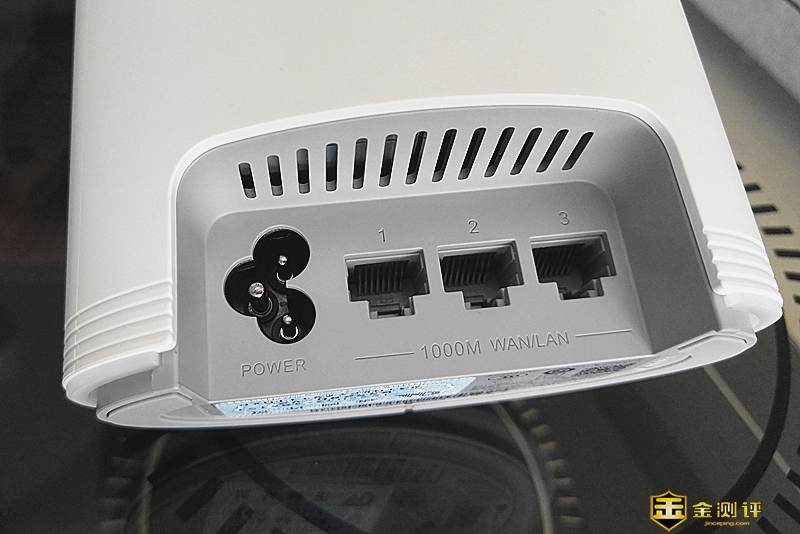 从它的后侧面可以看到它灰色底部内凹的上侧方设置了机身唯一的散热孔,下方设置三线电源插口和三个千兆网口,这三个网口没有标明哪个网口是WAN口或LAN口,因它默认有自动识别WAN口或LAN口能力,这一点很智能也很有人性化,真正实现想插哪就插哪,非常便捷。