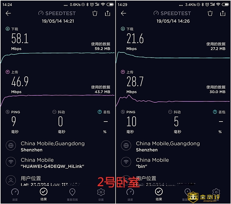 在1号卧室的同一位置,测得华为路由Q2 Pro的下载为58.2Mbps,上传速度为47.0Mbps,中国移动光猫路由器一体机的下载为29.4Mbps,上传速度为34.3Mbps;在2号卧室的同一位置,测得华为路由Q2 Pro的下载为58.1Mbps,上传速度为46.9Mbps,中国移动光猫路由器一体机的下载为21.6Mbps,上传速度为28.7Mbps;在3号主卧室的的同一位置,测得华为路由Q2 Pro的下载为57.4Mbps,上传速度为45.2Mbps,中国移动光猫路由器一体机的下载为9.37Mbps,上传速度为20.7Mbps;从三个卧室测得的数据很明显看到华为路由Q2 Pro的wifi信号要比中国移动光猫路由器一体机强多和稳定,且覆盖的范围更广,我家住在五楼,在一楼还能收到华为路由Q2 Pro的wifi信号,且上网很流畅。