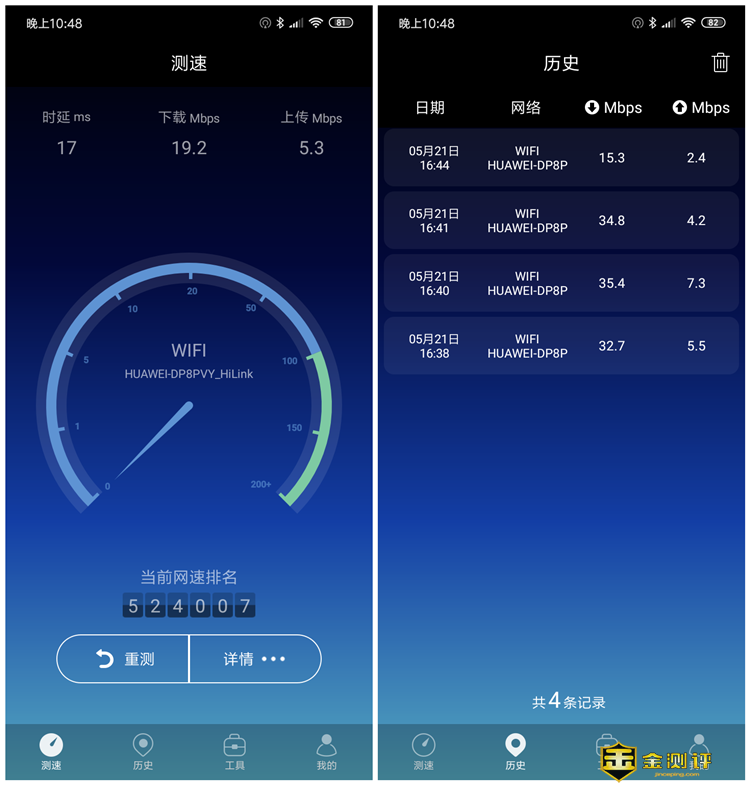 小米9使用的5GWIFI,历史记录自上而下是卧室A,卧室B,卧室C和客厅。可以看出下载速度在卧室C区域的下载速度和上传速度是最小的,由于传输距离最远,并且相隔2堵墙,所以需要配置子路由搭配使用。