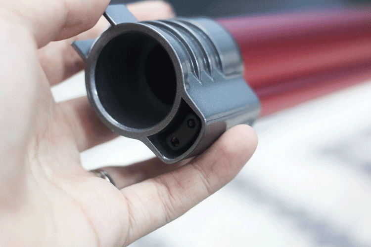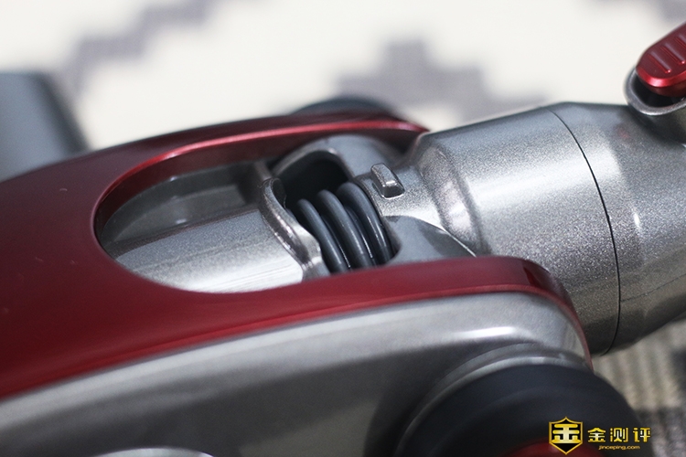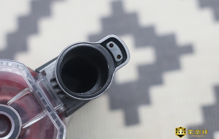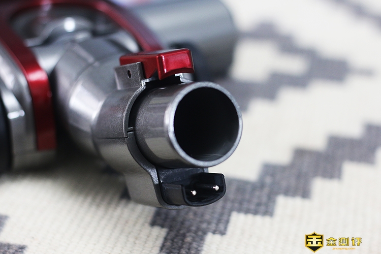 由于往下连接的是铝合金吸尘杆,所以连接口设计为圆形的“灰尘通道”以及外部的“电通道”,既保证了连接稳固也使得两者分工互不扰。
