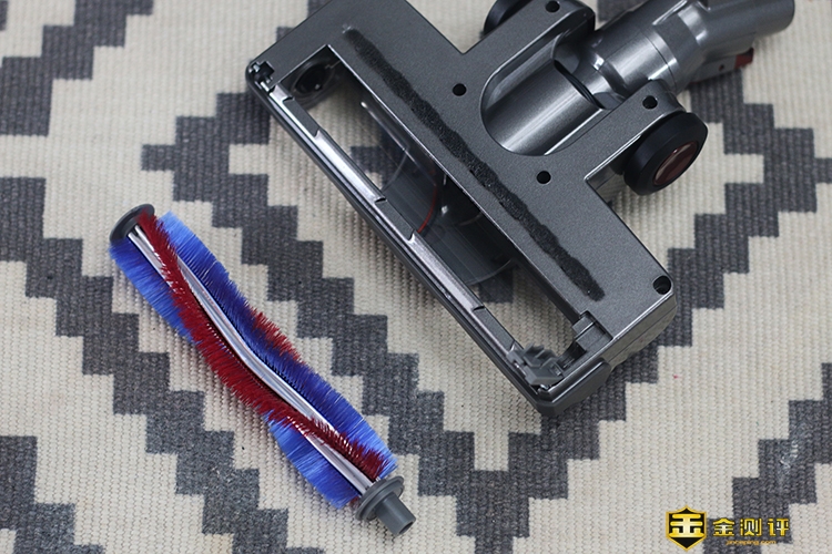 旋转地刷外壳部分透明设计,直接能够看到蓝红相间的刷子在里面。