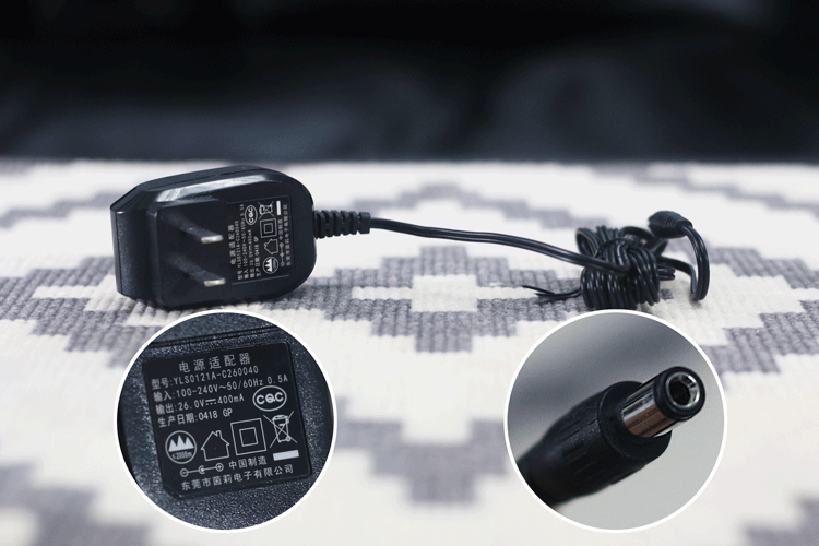 电源适配器为黑色双孔,充电接口也较为常见,输出为26V400mA。