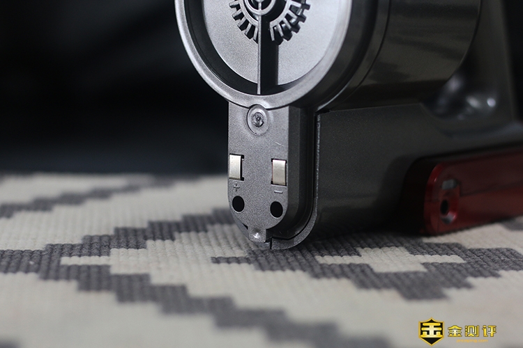 小尼熊V-1175无线吸尘器主机与尘杯之间采用金属触点的供电连接方式,且均设计在每个部件下部的U型装置中,设计还是很科技合理的。