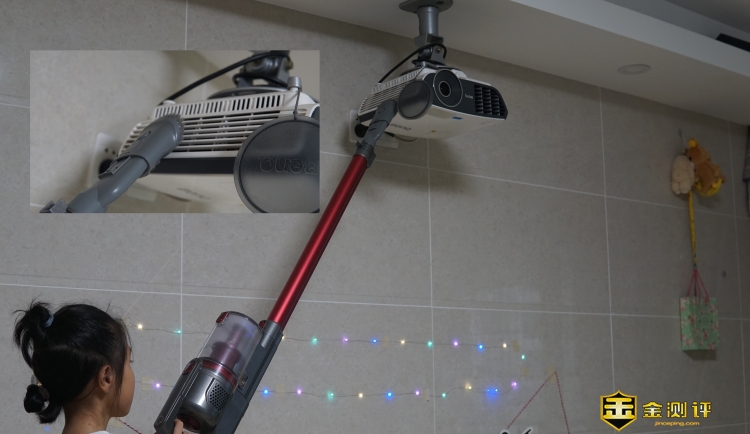 投影仪安装在天花上,积尘易、清理烦,以前清洁它都得搬高一点的凳子,而现在就简单多了。将长管与刷头组合起来,轻轻带动刷头,就可以很轻易地将投影仪上的尘埃吸走。