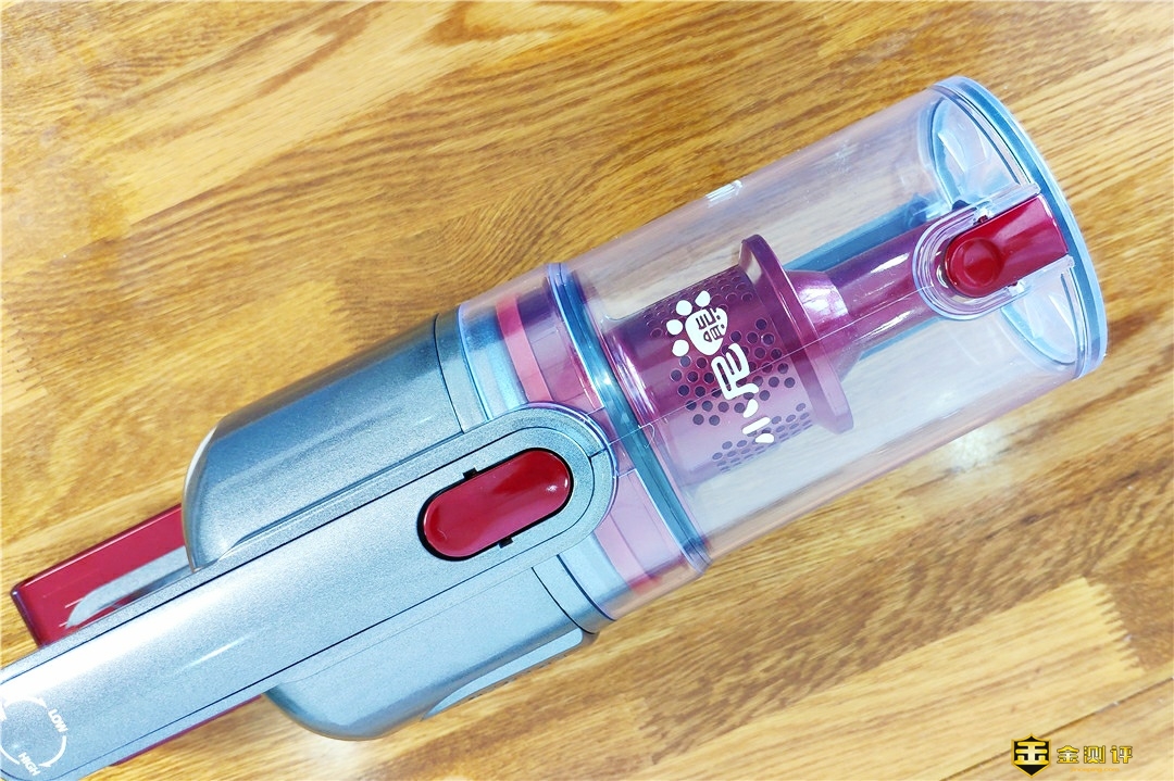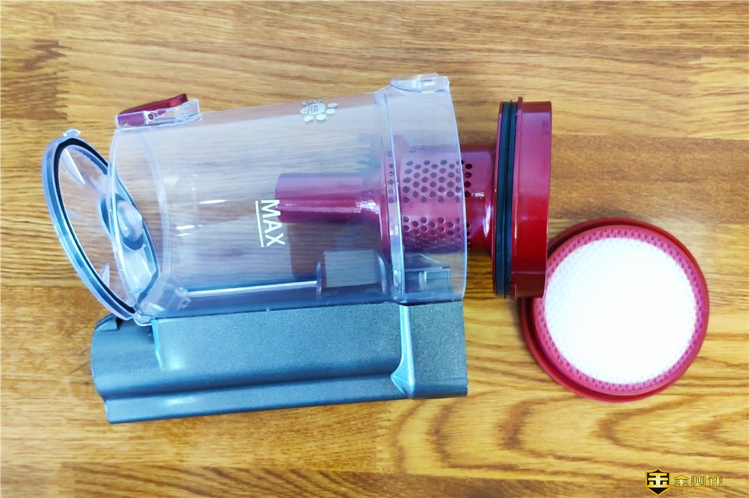 主机前端是尘杯,所有吸入的脏物都收集在尘杯内,尘杯容量1.0L,可以容纳较多的灰尘,加上透明设计,使用时能直观的确认尘杯内是否需要清理;尘杯内红色的是粗过滤网,能过滤掉较大的颗粒物,其内部还有一层可拆卸的细过滤网,能避免灰尘外漏。