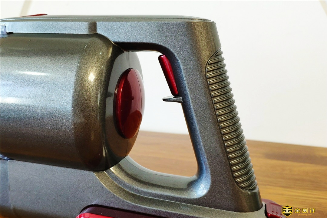 主机采用红+灰的配色方式,是经典的吸尘器配色,有很强的耐脏能力;整个机身外表均为塑料材质,但材质表面有类似金属的涂层,使整机看上去很有金属质感。