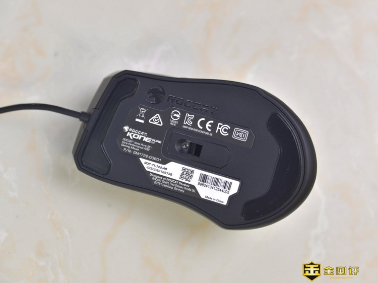 德国冰豹ROCCAT魔幻豹Kone Pure SE升级版的上下都贴有防滑脚贴,中间还贴有一张铭牌标签。上面印有产品的相关参数。
