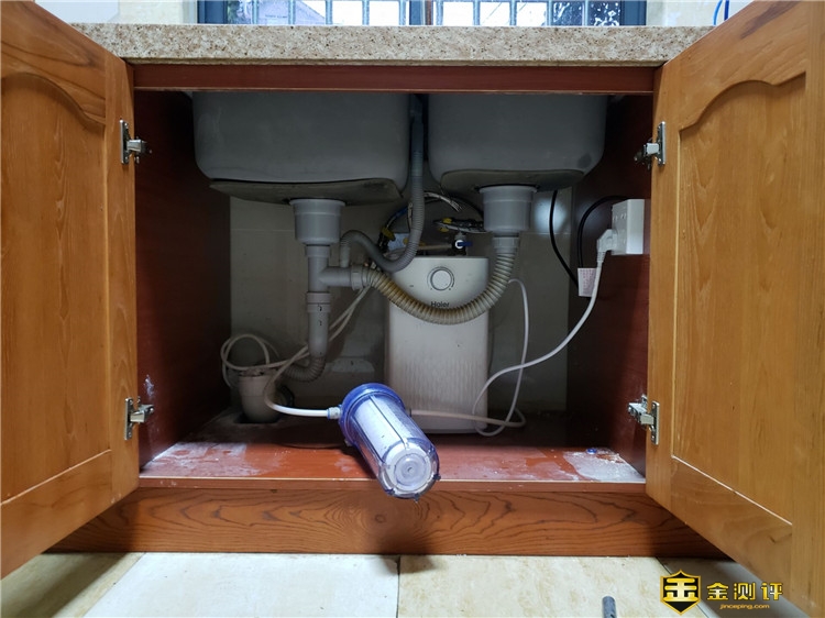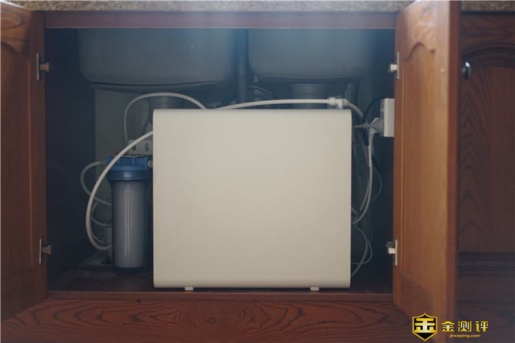水槽下面空间比较拥挤,好在S100的厚度只有14.6cm,横向放刚好还能关上柜门。当然最理想的摆位还是应该竖向放在厨柜左侧或者右面,这样的话看工作状态和换滤芯会更方便点。