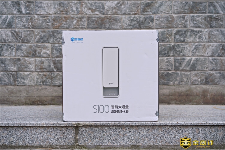 S100送来的时候,楼主还是有点意外的,包装非常的硕大,份量也很重,楼主都一度开始担心家里的厨柜到底能不能装的下的问题。包装正面最醒目的是S100的正面渲染照,左上角可以看到352的品牌Logo,渲染照下面可以看到净水器的产品型号和名称:S100智能大通量反渗透净水器。