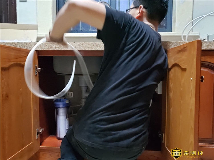 安装是由本地的一个服务网点负责的,因为白天要上班,时间上有点冲突,师傅主动提出早上或者晚上过来安装,这倒是解决了楼主的后顾之忧,晚上7点左右师傅如约而至,简单看了下后,确认安装尺寸没问题后,开始拆原来的超滤净水器(不收费)。