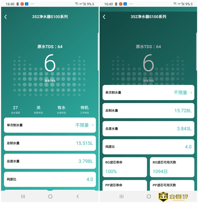 下面这个配对完成后,352净水器S100的主界面,能够实时显示原水TDS、出水TDS、总制水量、总废水量纯度比及滤芯的寿命、可用天数等信息。TDS很准确,显示的数据几乎跟楼主用小米TDS测出来相差无几,出水效果好不好直接看APP就可以了,能省了不少事。