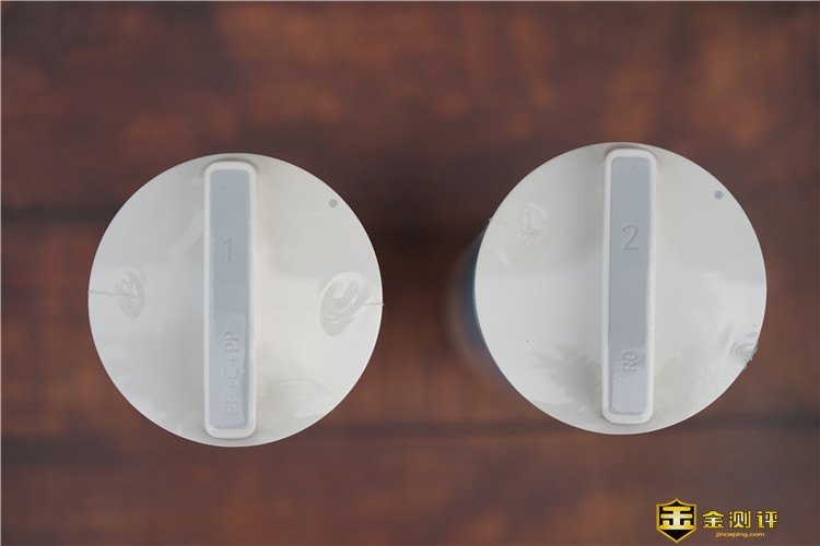 头部的接口情况,左侧的为1号前置复合滤芯,右侧为2号RO反渗透滤芯,接口布局基本一致,主要区别在于进水口的数量上面。