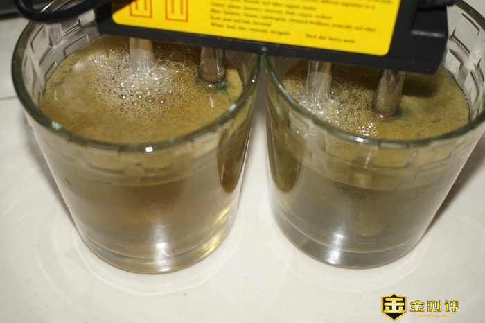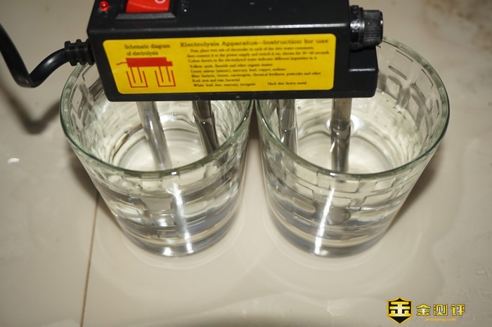 继续使用电解的方式测试 这次依然选择自来水与这三种净水器产出的水进行测试,在开启后几十秒内,自来水与微滤净水器的表面就产生了一层黑色的漂浮物,而储水式的净水器颜色明显变黄,只有352净水器水的颜色仅仅是淡淡的变色,可见352产出的水质是最好的。
