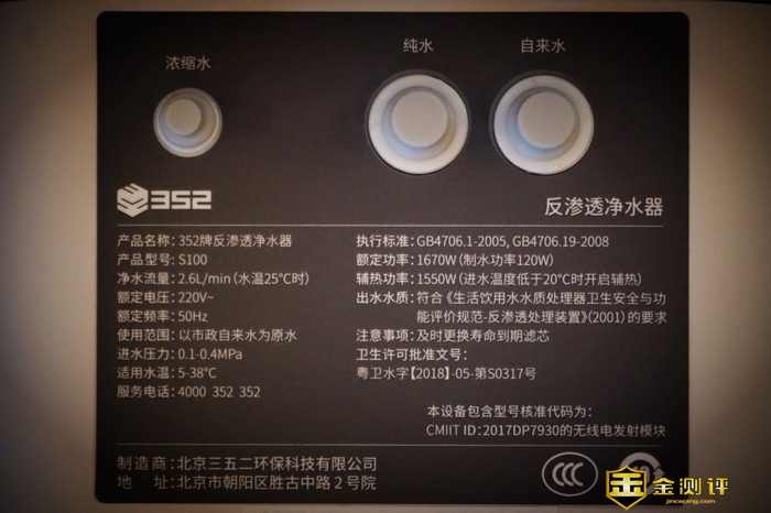 352反渗透净水器的背面为软管的三个接口,分别是自来水进水口、纯水的出水口以及废水的排放口,每一个接口均有文字加以标注。接口下方的详细的介绍了净水器的参数以及标准。