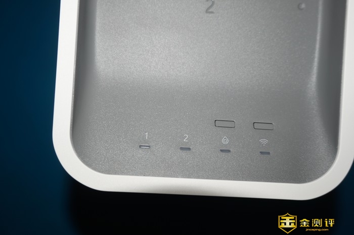 352反渗透净水器的控制面板放置于机器正面的下部,有一二级滤芯、自动加温、网络四个状态指示灯,可以显示对应的工作情况,在制水与网络上方还设置了两枚功能按键。