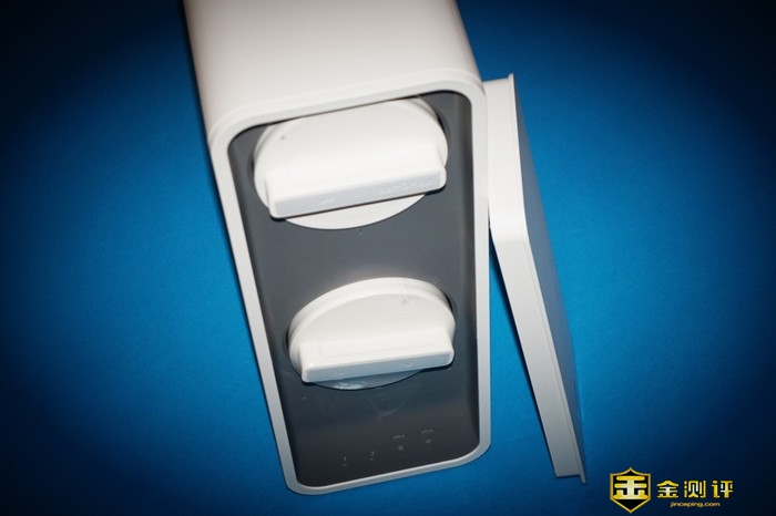 352反渗透净水器的前面板采用了磁吸式的可拆卸设计,可以轻松取下,面板表面印制了详细的滤芯安装方法,只需简单的一按一转就可以完成,非常的简单,即使个人也可以在家简单操作完成,机身内设置了两个圆形的滤芯仓,将其它元件均进行了隐藏,更加简洁整齐。