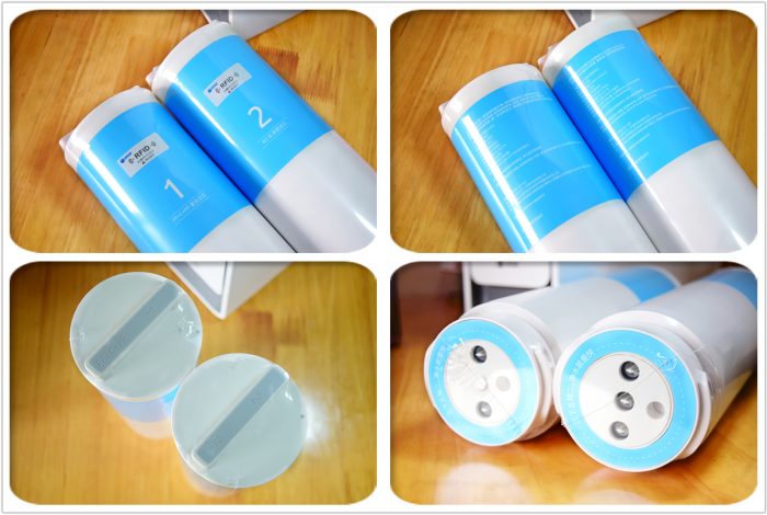 其中1号为前置复合滤芯,由折叠PP棉、优质活性炭棒和PP熔喷棉组成,能滤除水中的泥沙、铁锈、异味、余氯等,可以对水进行初步净化;而2号为反渗透滤芯,能拦截水中的细菌、重金属、有机物质等,而且理论过滤精度可达0.0001μm,净化后的水可以直接饮用。