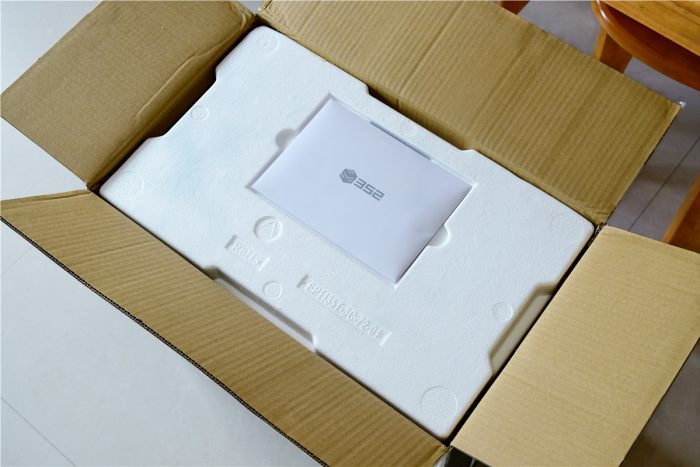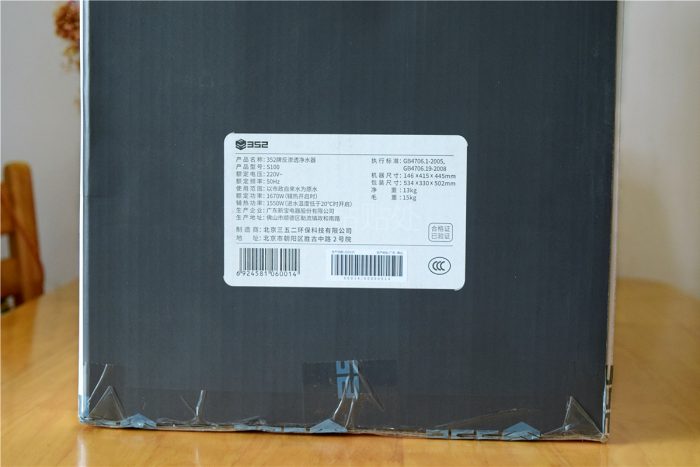 352智能净水器采用了白色纸质包装盒,整体设计十分简洁,正面左上角是352产品logo,中间位置印有净水器的实物图片和名称,其中大大的“智能大通量”字样很醒目。另外在包装盒侧面还有个白色标签,上面是关于净水器的参数介绍,可以让大家有个简单了解。