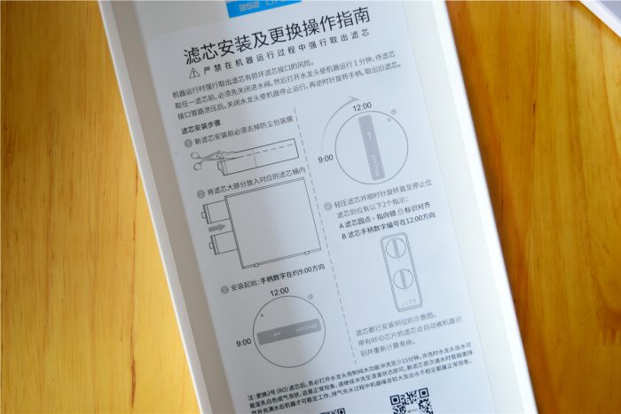 352智能净水器的前面板采用了磁吸式设计,安装和拆卸都是很方便,拆下面板后,就能够看到两个大大的滤芯安装槽,另外在前面板的背面还印有滤芯安装和更换操作方法,可以方便用户轻松完成滤芯安装或更换操作。