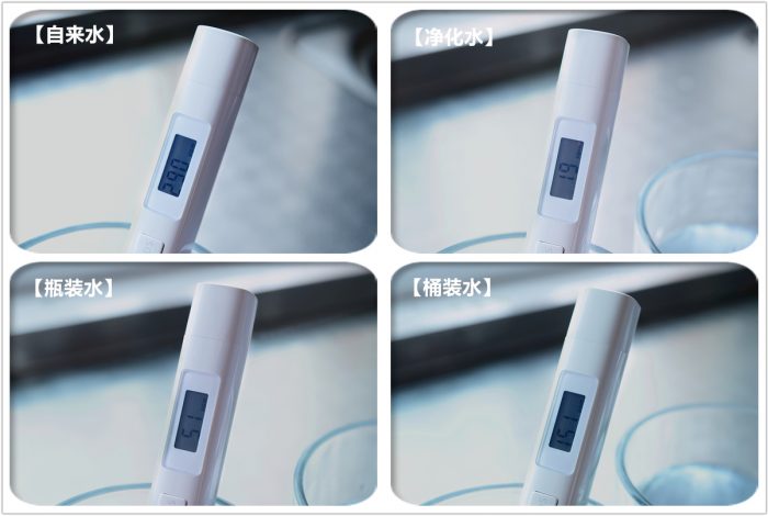 先来揭晓上面4杯水的真实身份,这里使用TDS检测笔分别对于4杯水做了下检测,其中TDS结果分别为:自来水为290ppm、净化水为19ppm、瓶装水(矿泉水)为51ppm、桶装水(井水)为151ppm。通过上面的测试,可以看到家中自来水的TDS值已经达到了290ppm,不过让我没想到的是一直喝的桶装水(井水)TDS值竟然也达到了151ppm,幸好一直都是烧开了喝。