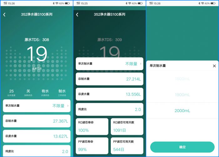 进入到352智能净水器控制界面,在这里可以不仅能查看原水TDS值、出水TDS值、出水温度、加热状态、水源状态和工作状态等信息,还能查看总制水量、总废水量、纯废比、滤芯寿命、滤芯可用天数等信息,而且还能手动设置“单次制水量”。其中352智能净水器还加入了智能辅热模块,能够让净水器在全季节都有稳定的水量。
