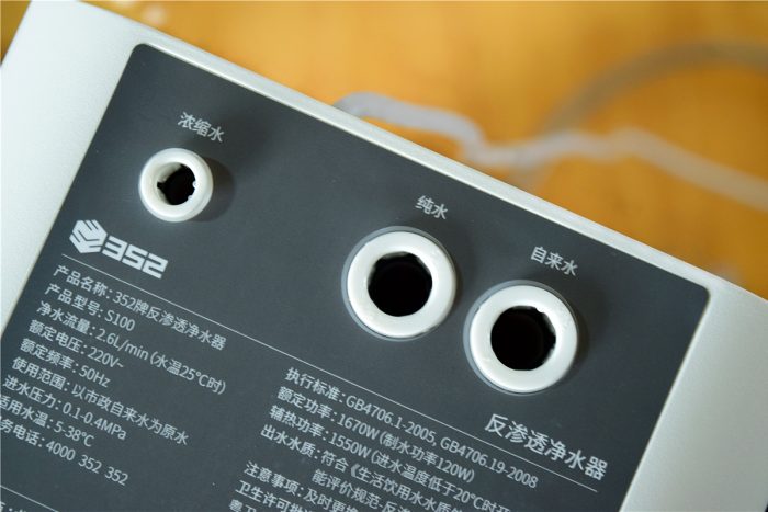 净水器的接口都被集中放置到了机身顶部靠近后方的位置,从左到右依次为浓缩水口、纯水口和自来水口,在接口的上方都有文字标识,另外这里还贴有一张灰色的标签,上面是关于净水器的各种参数介绍。