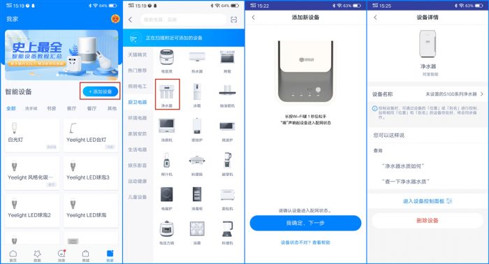 352智能净水器还支持智能操控功能,支持APP智能控制,不过并没有配备专用的APP,需要借助天猫精灵APP使用。需要先进行添加设备操作,根据系统提示进行逐步操作即可,添加成功后会自动进入到“设备详情”界面,即可进入到控制面板界面,还能直接通过天猫精灵查看净水器水质。