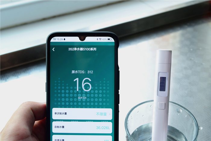这里对352智能净水器控制界面的原水TDS值和出水TDS值和实际检测值做了下对比,其中出水TDS值和TDS检测笔基本一致,不过原水TDS值相比测试值要稍有差别。